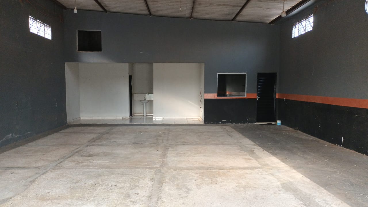 Um galpão com 140m² de área construída, com escritório, copa e banheiros.
