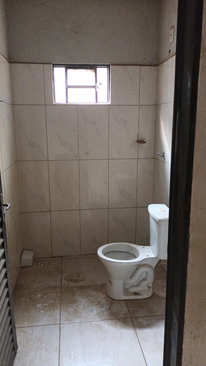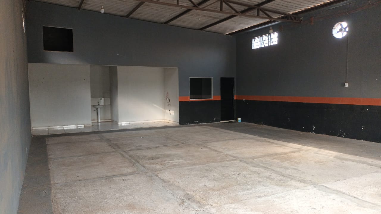 Um galpão com 140m² de área construída, com escritório, copa e banheiros.